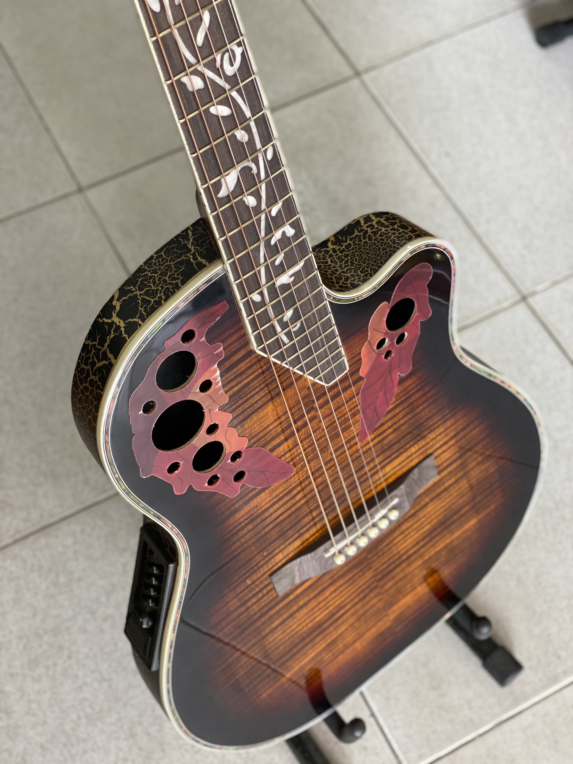 Điểm nhấn của guitar acoustic ovation chard chính là ở thiết kế. Mà nổi bật nhất là nằm ở mặt đàn khoét lỗ chạm khắc hoa văn độc đáo. Các chi tiết trang trí kết hợp hài hòa với nhau. Chúng mô phỏng hoàn hảo chiếc lá khô mùa thu thật tình tứ và lãng mạn.