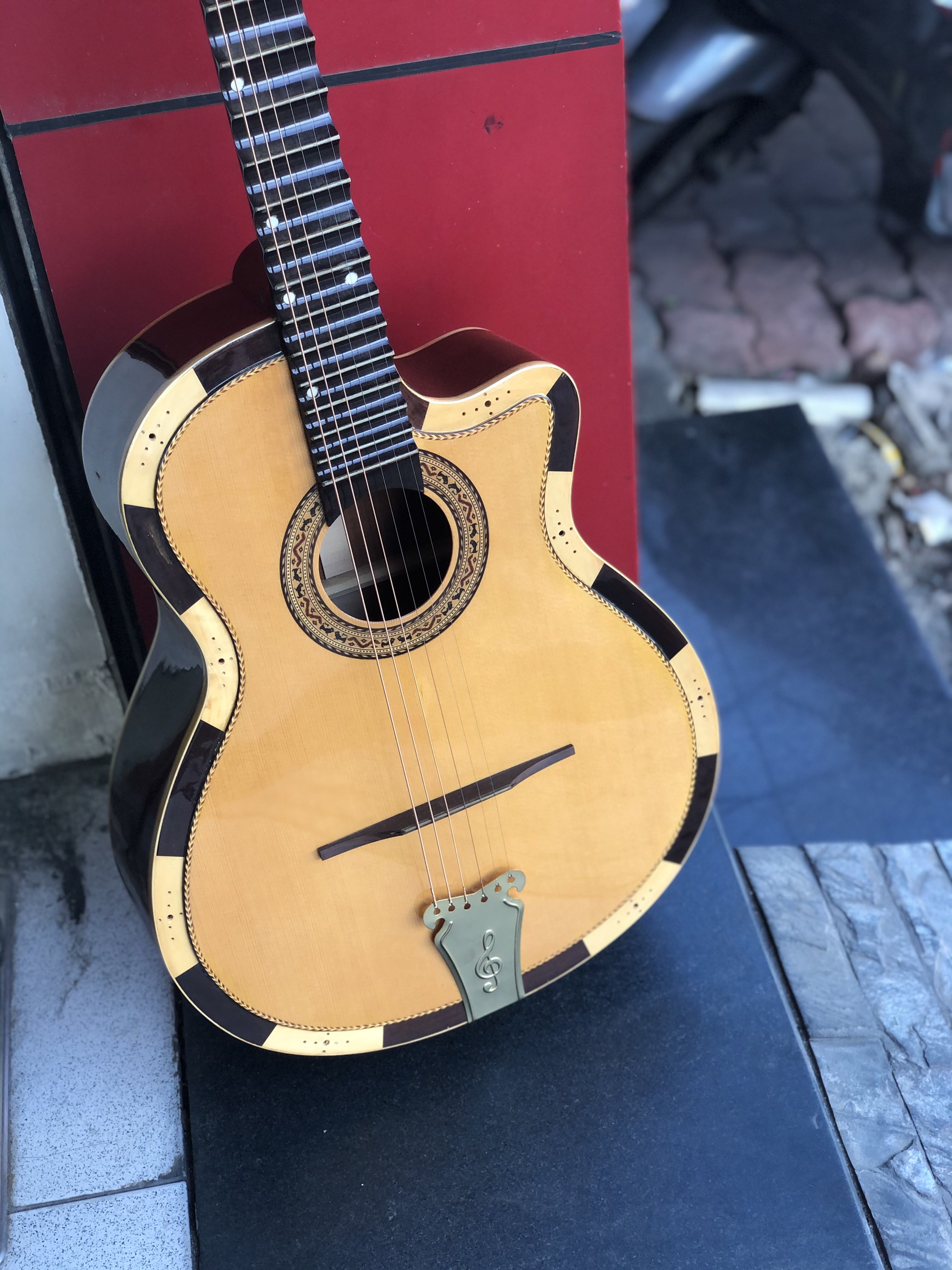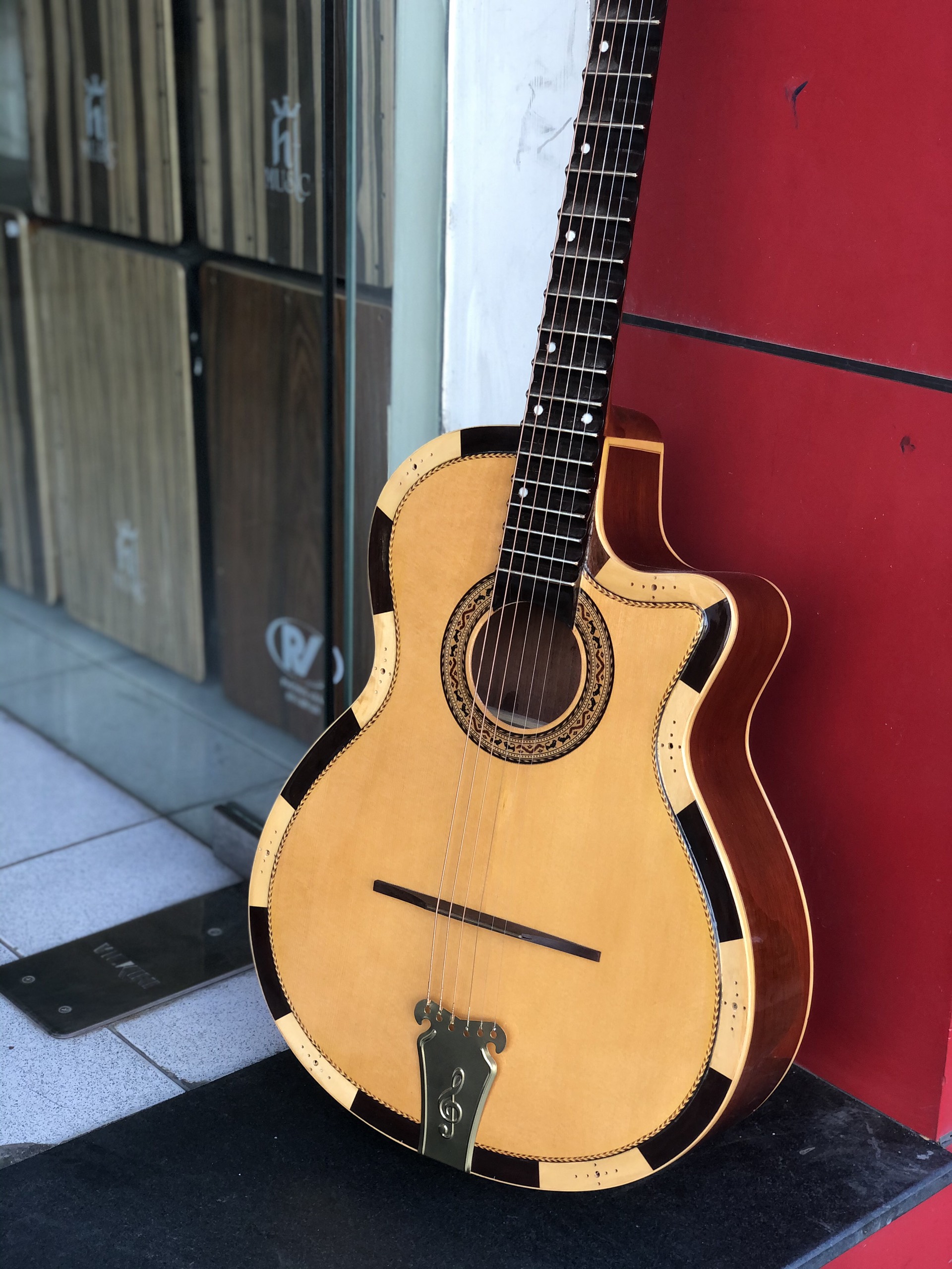Đàn guitar thùng cổ nhạc được làm từ gỗ hồng đào. Đây là loại gỗ chống mối mọt cao, có màu và vân gỗ rất đẹp, mùi thơm nhẹ. Đồng thời gỗ khá mềm và tạo ra âm thanh hay. Vì vậy mà gỗ hồng đào thường được ứng dụng để làm nhạc cụ như đàn, sáo.