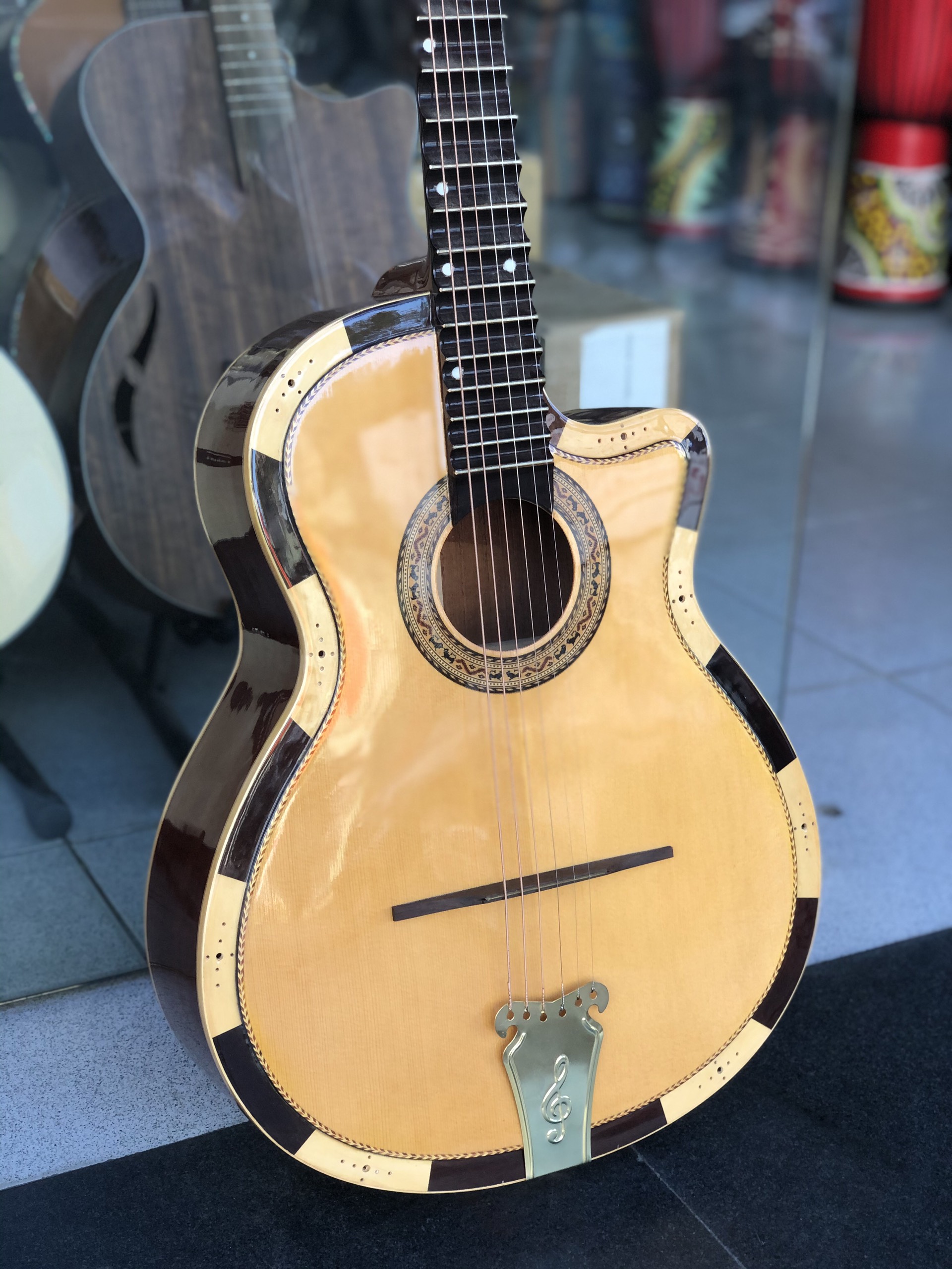 Đàn guitar thùng cổ nhạc sơn bóng cùng với những điểm nhấn vô cùng bắt mắt. Mặt thùng đàn được viền quanh bởi hai màu trắng, nâu tạo điểm nhấn lạ mắt cho cây đàn.