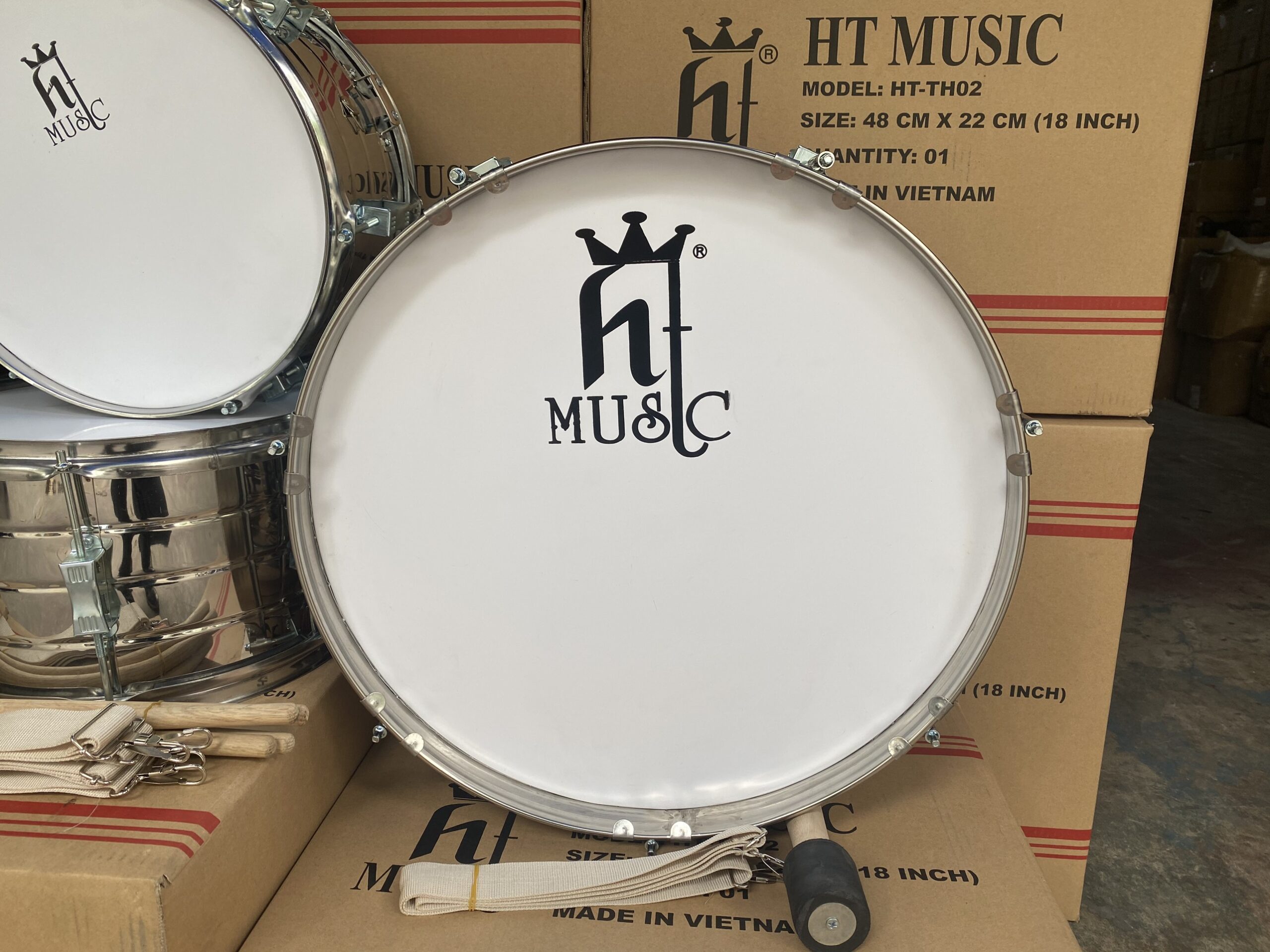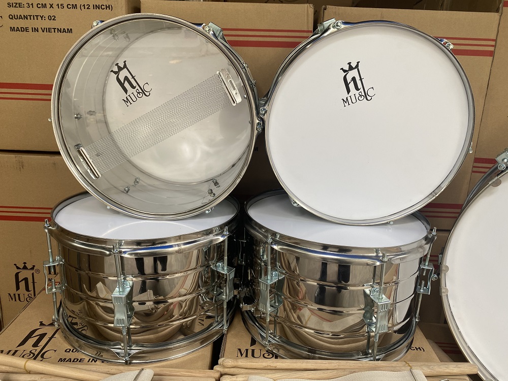 Mua bộ trống đội inox HT Music sẽ có đầy đủ dùi gõ trống và dây đeo. Bộ sản phẩm được đóng hộp carton đúng quy cách, vận chuyển nhanh đến tận tay khách hàng.