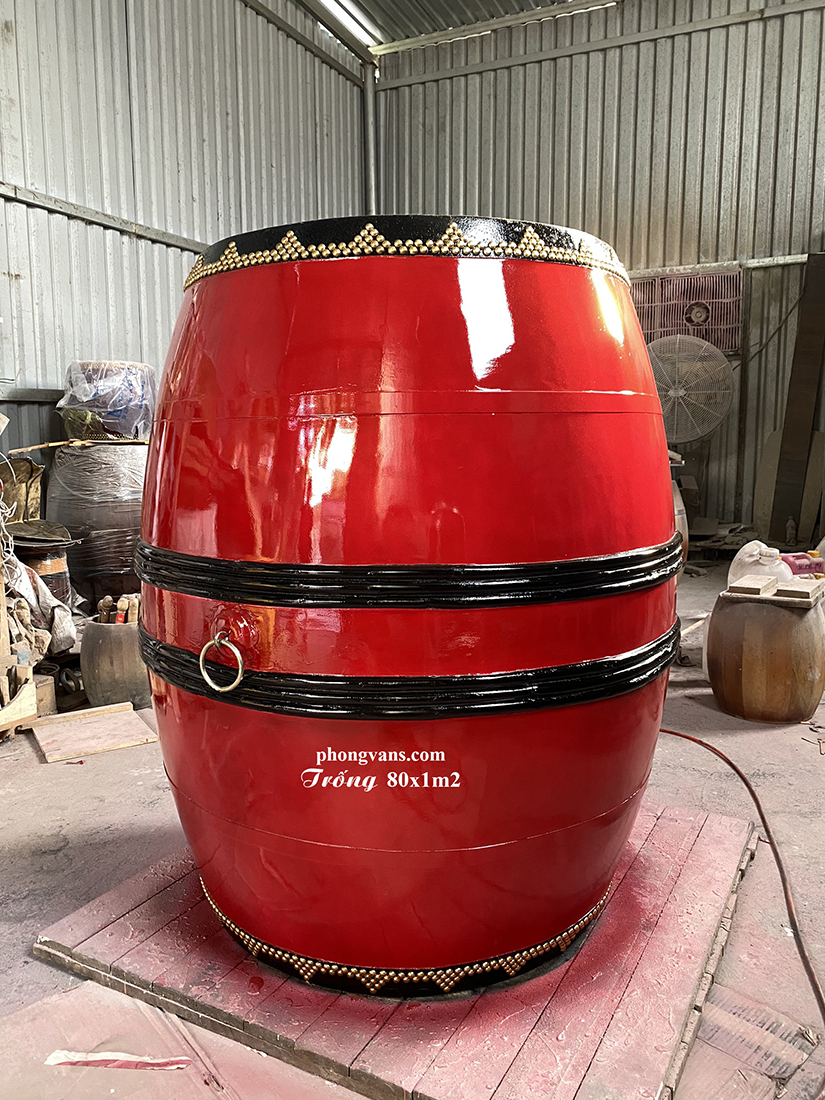 Với đai đen xung quanh trống giúp cho sản phẩm thêm chắc chắn; cùng với 2 móc 2 bên trống; đường kính mặt trống là 80cm, cao 1m2. Phù hợp dùng trong nhà thờ, đình hay lễ hội.